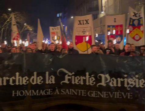 Les images du rassemblement montrent des manifestants portant des banderoles et des drapeaux. L’une d’entre elles arborait l’inscription « Fierté Parisienne » associée à un hommage à Sainte-Geneviève. Une grande banderole déployée par le groupe mettait en avant la « Fierté Parisienne » et l’hommage à la sainte.