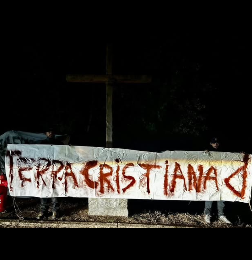 Le 16 octobre, des jeunes Corses ont déployé une banderole « Terra Cristiana » à l’entrée du village de Quasquara pour revendiquer l’appartenance chrétienne de leur terre. Ils exigent le retrait d’une croix qu’ils jugent imposée. L’action, photographiée et diffusée par Occidentis, illustre les tensions identitaires en Corse autour des symboles religieux.